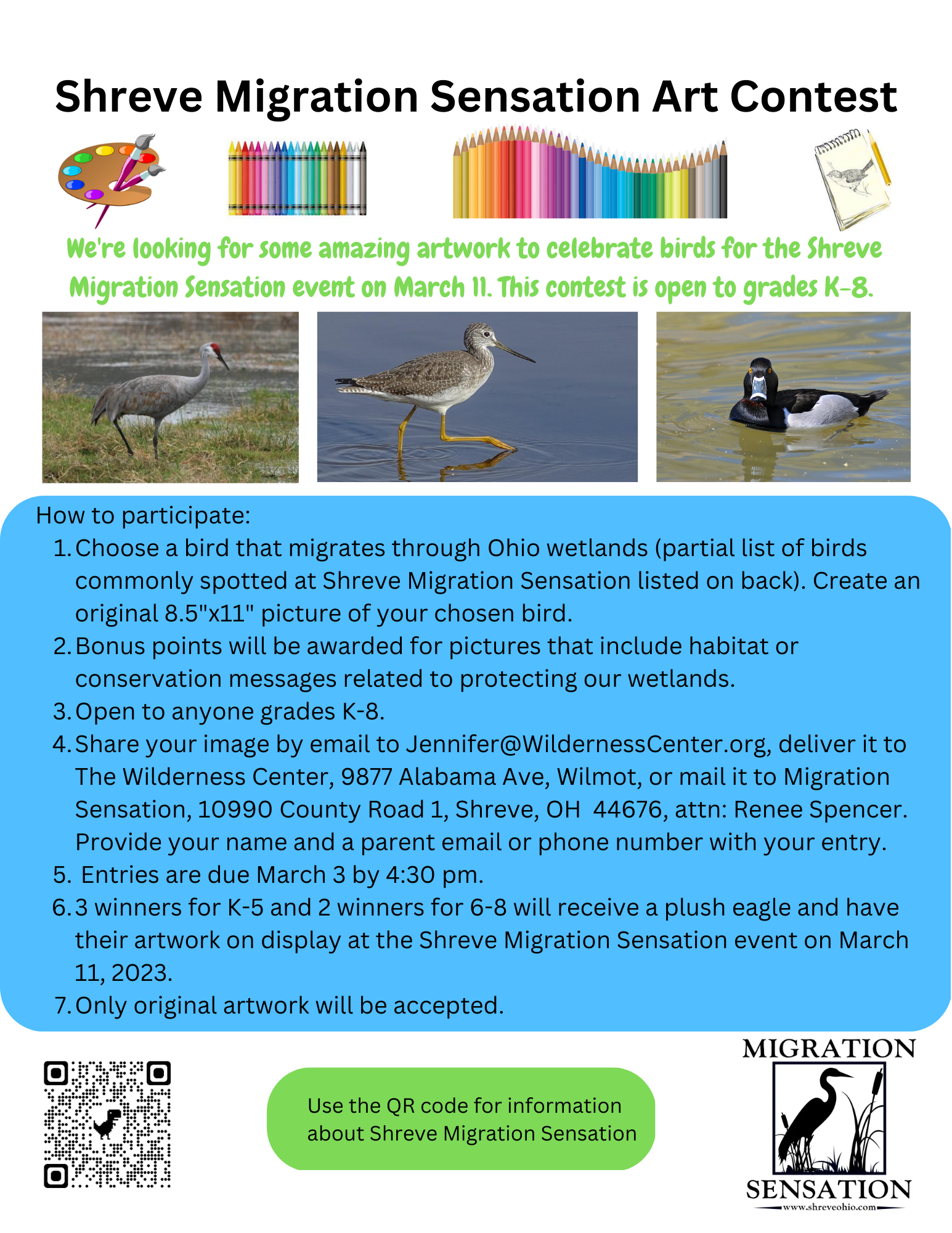 Shreve Migration Sensation's desire is to keep our event free to the public! ODNR provides us with a grant which helps us tremendously but does not cover all our expenses. We will have donation jars at the Registration tables, a raffle tickets for a tour of the Big Spring, Time & Optics item, Turtle Print. We also have t-shirts and sweatshirts for purchase.