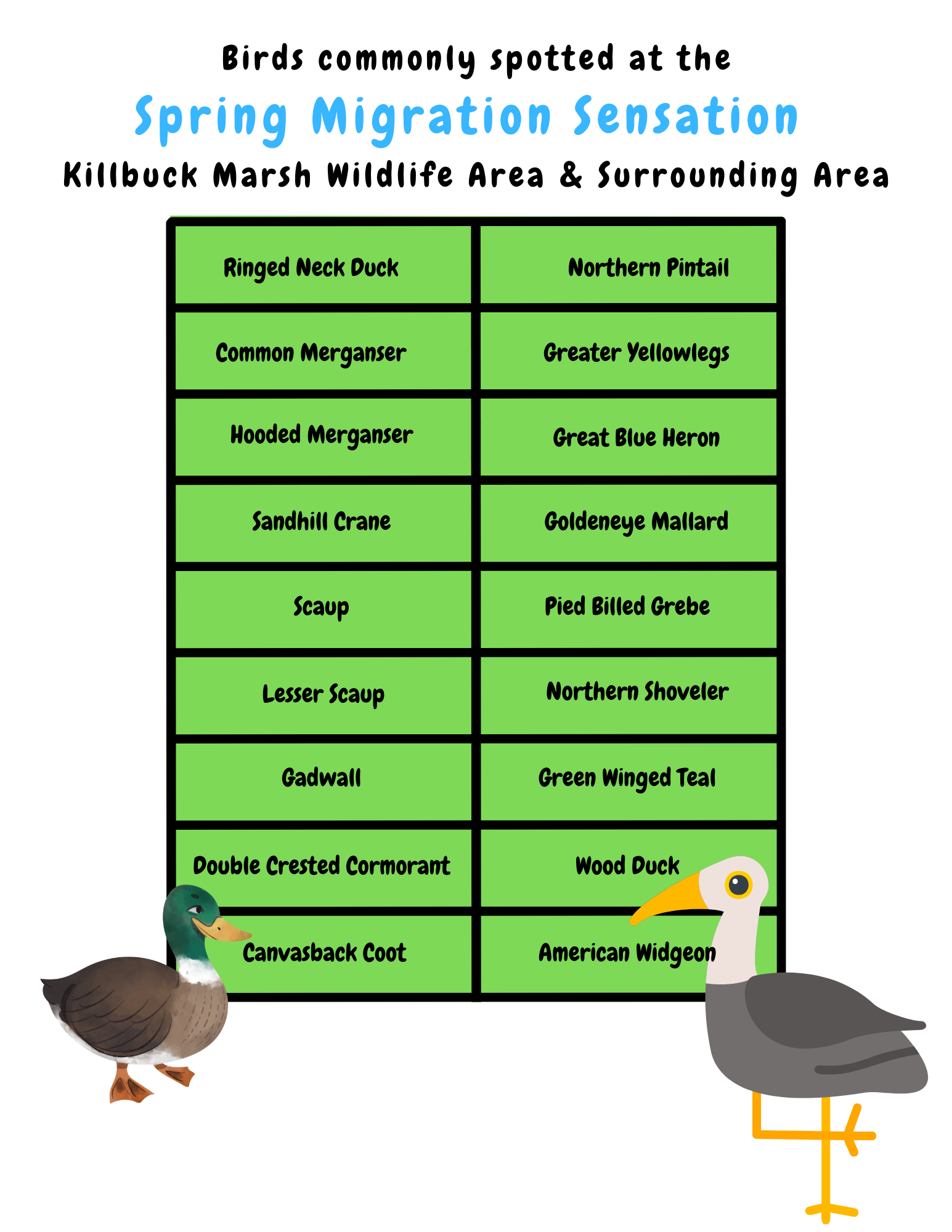 Experienced birders will be at these five prime locations from 8:00 AM - 12:00 PM to guide visitors in spotting a variety of species. The following areas are highlights where birds were spotted in 2024: