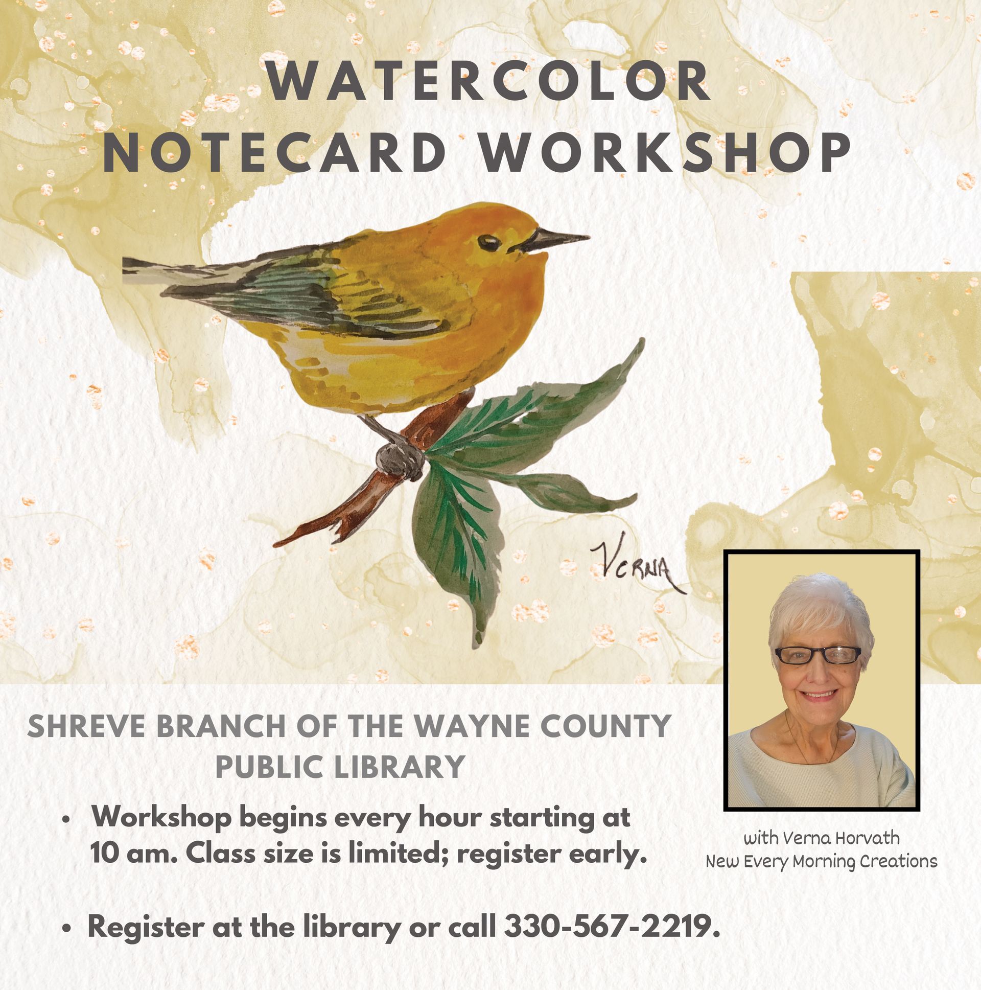11:00 - 2:00 PM – Watercolor Notecard Workshop with Verna Horvath (Shreve Library) – Sessions start every half hour. Limited to 8 participants per session. Register at the library or call 330-567-2219.